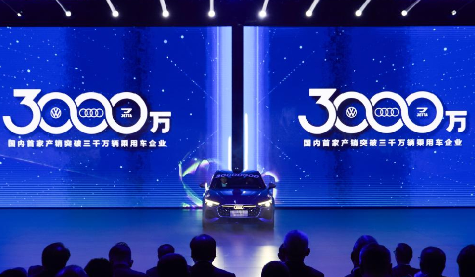 The 30 millionth car manufactured by FAW-Volkswagen is pictured at an offline ceremony in Changchun, northeast China's Jilin Province, Oct. 30, 2025. The offline ceremony celebrating the 30 millionth car rolling off the FAW-Volkswagen production line was held here on Thursday. (Xinhua/Zhang Nan)