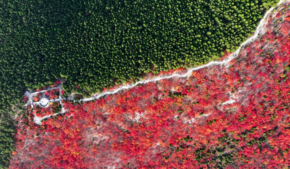 An aerial drone photo shows the autumn view of Xiezi Mountain in Jinan City, east China's Shandong Province, Nov. 3, 2025. (Xinhua/Guo Xulei)