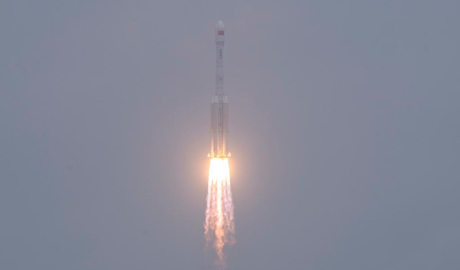 A modified Long March-7 carrier rocket carrying the Yaogan-46 satellite blasts off from the Wenchang Spacecraft Launch Site in south China's Hainan Province, Nov. 3, 2025.