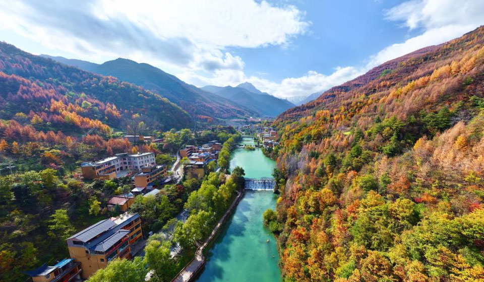 An aerial drone photo taken on Nov. 2, 2025 shows the autumn scenery at Guan'egou Scenic Area in Dangchang County, Longnan City, northwest China's Gansu Province. (Photo by Liu Hui/Xinhua)
