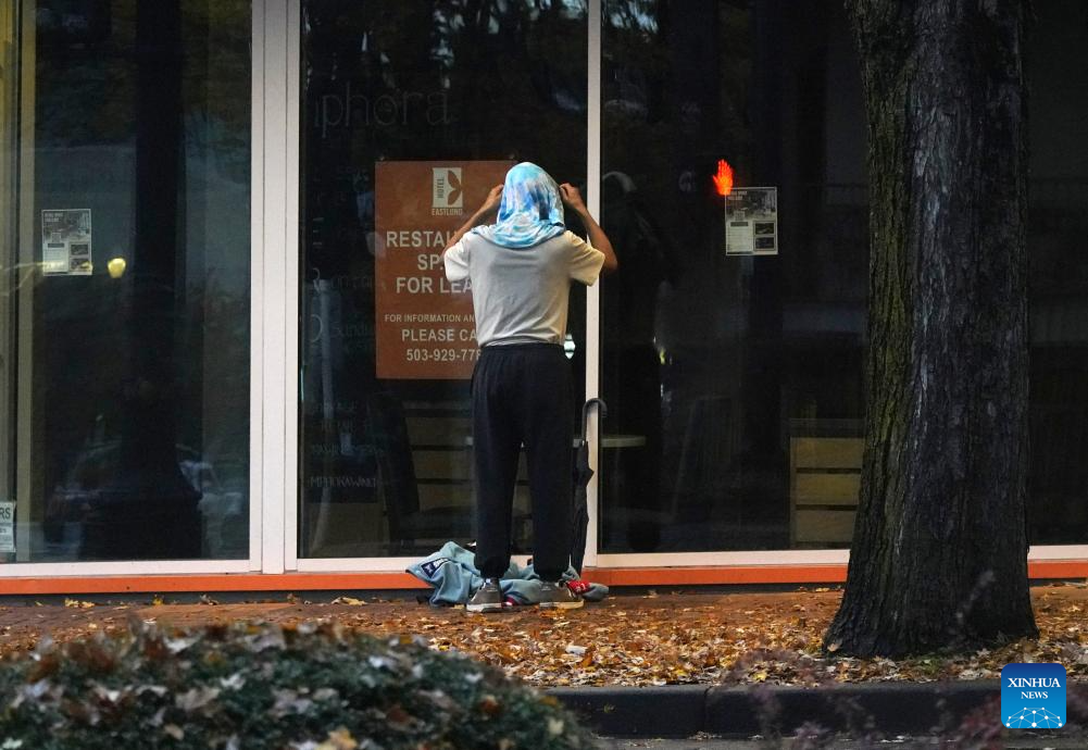 A homeless person changes clothes on the sidewalk in Portland, Oregon, the United States, Nov. 5, 2025. On Wednesday, the U.S. federal government shutdown entered its 36th day, surpassing the previous 35-day record set during the 2018-2019 shutdown, making it the longest government shutdown in U.S. history. (Xinhua/Wu Xiaoling)