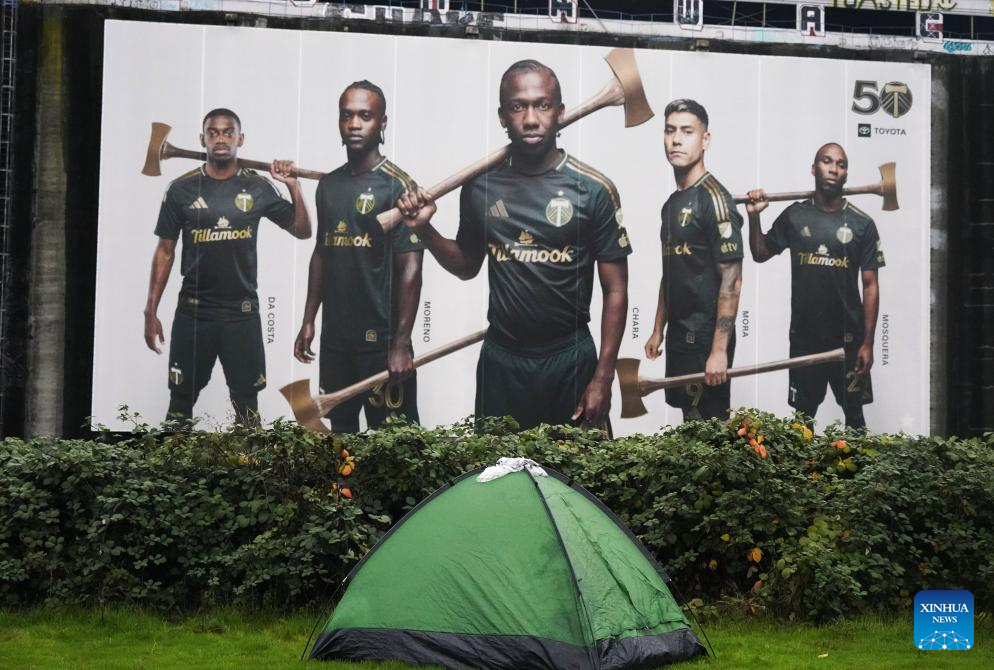 A homeless person's camp is pictured in Portland, Oregon, Nov. 5, 2025. On Wednesday, the U.S. federal government shutdown entered its 36th day, surpassing the previous 35-day record set during the 2018-2019 shutdown, making it the longest government shutdown in U.S. history. (Xinhua/Wu Xiaoling)