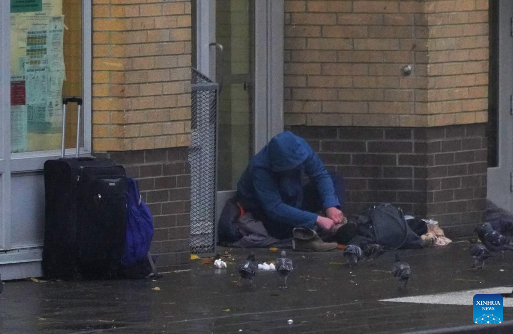 A homeless person is seen on the sidewalk in Portland, Oregon, the United States, Nov. 5, 2025. On Wednesday, the U.S. federal government shutdown entered its 36th day, surpassing the previous 35-day record set during the 2018-2019 shutdown, making it the longest government shutdown in U.S. history. (Xinhua/Wu Xiaoling)