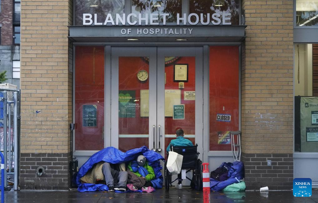 Homeless persons are seen on the sidewalk in Portland, Oregon, the United States, Nov. 5, 2025. On Wednesday, the U.S. federal government shutdown entered its 36th day, surpassing the previous 35-day record set during the 2018-2019 shutdown, making it the longest government shutdown in U.S. history. (Xinhua/Wu Xiaoling)