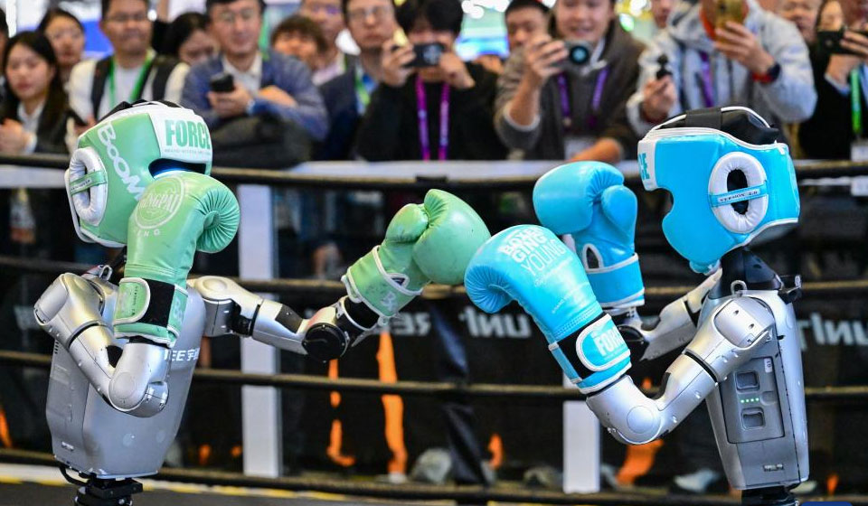 Two humanoid robots perform a session of fighting at civilian robotics company Unitree's booth during the China International Import Expo (CIIE) in east China's Shanghai, Nov. 6, 2025. Straight punches, hook punches, left and right side kicks...the fighting session, staged by two G1 humanoid robots wearing helmets and boxing gloves at the booth of Unitree here on Thursday, attracted lots of visitors and won rounds of applause. (Xinhua/Cai Xiangxin)