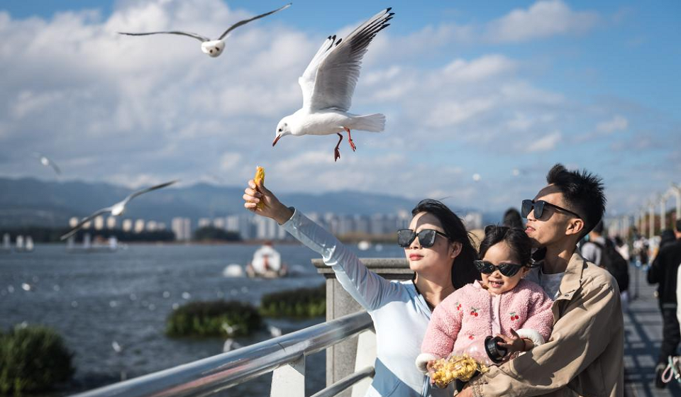 Tourists feed black-headed gulls at the Cuihu Park in Kunming, southwest China's Yunnan Province, Nov. 10, 2025. Black-headed gulls migrate to Kunming for the warm weather there in winter. (Xinhua/Wang Guansen)