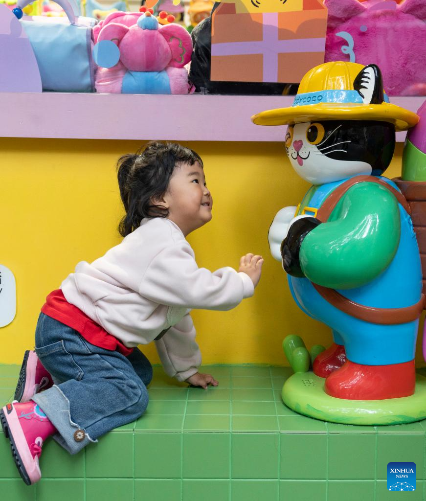 A child looks at a kitten statue at the door of a shop at the Yuyuan Road Historical and Cultural Block in east China's Shanghai, Nov. 12, 2025.