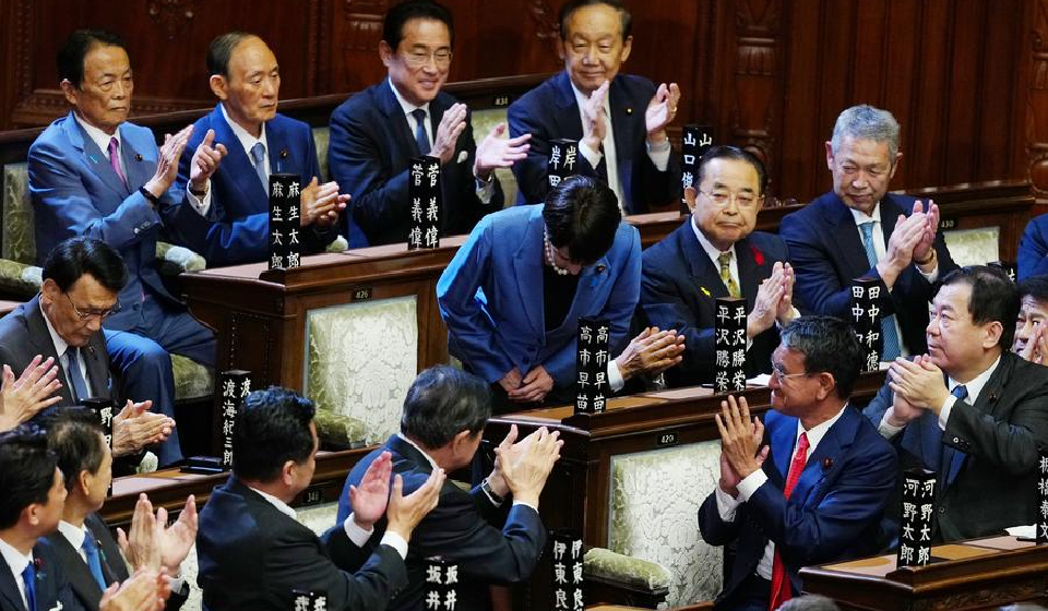 Sanae Takaichi (C) bows after winning the prime ministerial designation vote in the House of Representatives in Tokyo, Japan, Oct. 21, 2025. (Xinhua/Jia Haocheng)