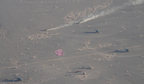 The return capsule of the Shenzhou-21 spaceship, carrying the Shenzhou-20 astronauts Chen Dong, Chen Zhongrui and Wang Jie, touches down at the Dongfeng landing site in north China's Inner Mongolia Autonomous Region, Nov. 14, 2025. (Xinhua/Li Zhipeng)