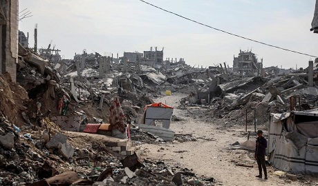 A Palestinian is seen in a street with destroyed homes in Jabalia city, northern Gaza Strip, with yellow-painted concrete blocks placed by the Israeli army visible in the background that marks the Yellow Line, Nov. 2, 2025. (Photo by Rizek Abdeljawad/Xinhua)