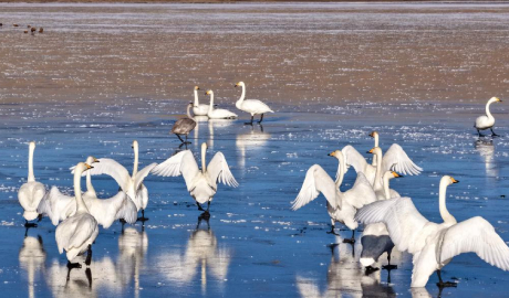 Photo taken on November 18, 2025 shows the Luanniao Lake Wetland at the Shandan Horse Ranch in northwest China’s Gansu. Pure white whooper swans stretched their wings and glided elegantly across the deep blue waters. (Wang Chao/Guangming Pictures)