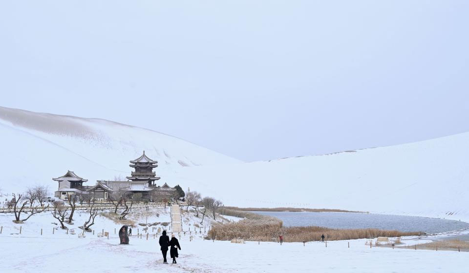 Tourists visit the Mingsha Mountain and Crescent Spring Scenic Area in Dunhuang City, northwest China's Gansu Province, on Nov. 23, 2025. Covered in a blanket of snow, the well-known tourist attractions in Dunhuang presented a stunning winter landscape. (Photo by Zhang Xiaoliang/Xinhua)