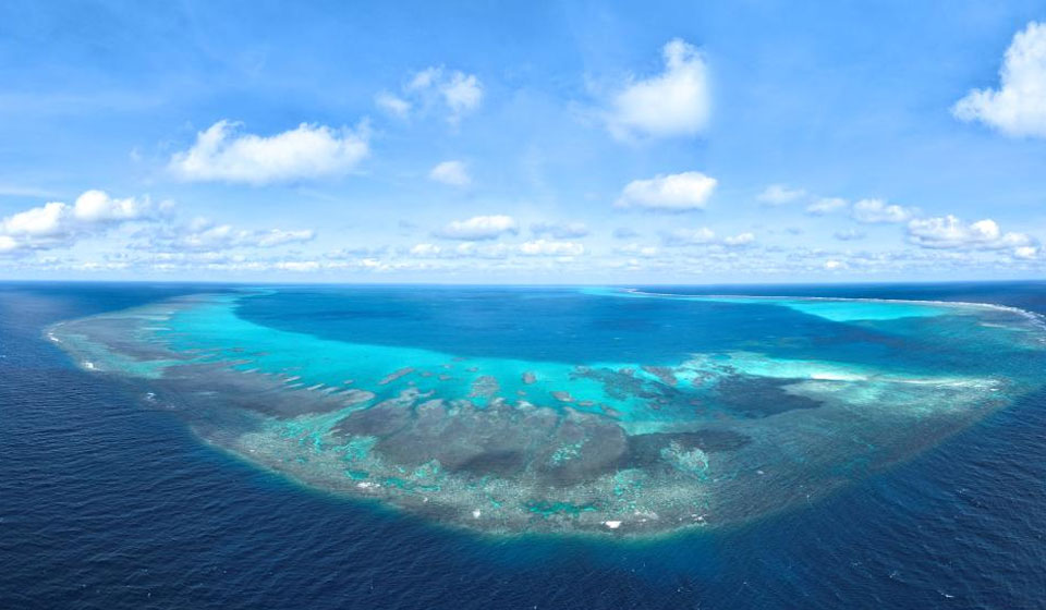 An aerial drone photo taken on Nov. 14, 2025 shows a panoramic view of China's Huangyan Dao in the South China Sea. Huangyan Dao is part of China's Zhongsha Qundao with diverse natural ecosystem. (Xinhua/Bei He)
