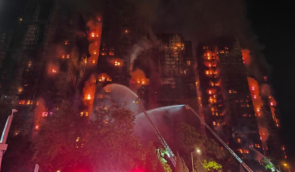 This photo taken on Nov. 26, 2025 shows rescuers working on a residential building fire site in Hong Kong, south China. (Xinhua/Chen Duo)