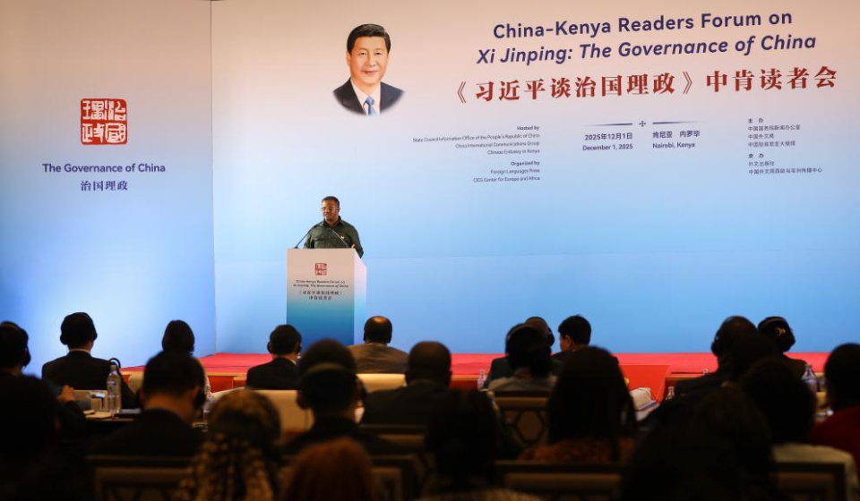 William Kabogo Gitau, Kenya's cabinet secretary in the Ministry of Information, Communications and the Digital Economy, speaks at a forum on the English edition of the fifth volume of "Xi Jinping: The Governance of China" in Nairobi, the capital of Kenya, Dec. 1, 2025. A forum on the English edition of the fifth volume of "Xi Jinping: The Governance of China" was held in Nairobi, the capital of Kenya, on Monday, with about 200 participants attending the event.