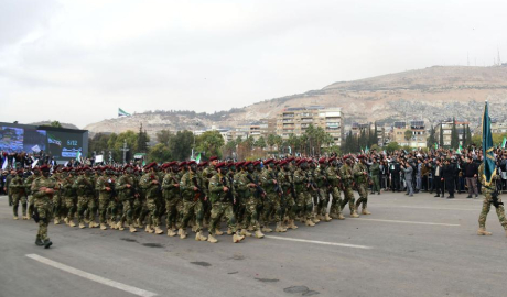 The parade also featured a military paragliding performance, with aircraft flying over central Damascus in synchronized formations as crowds gathered along the main road to watch.