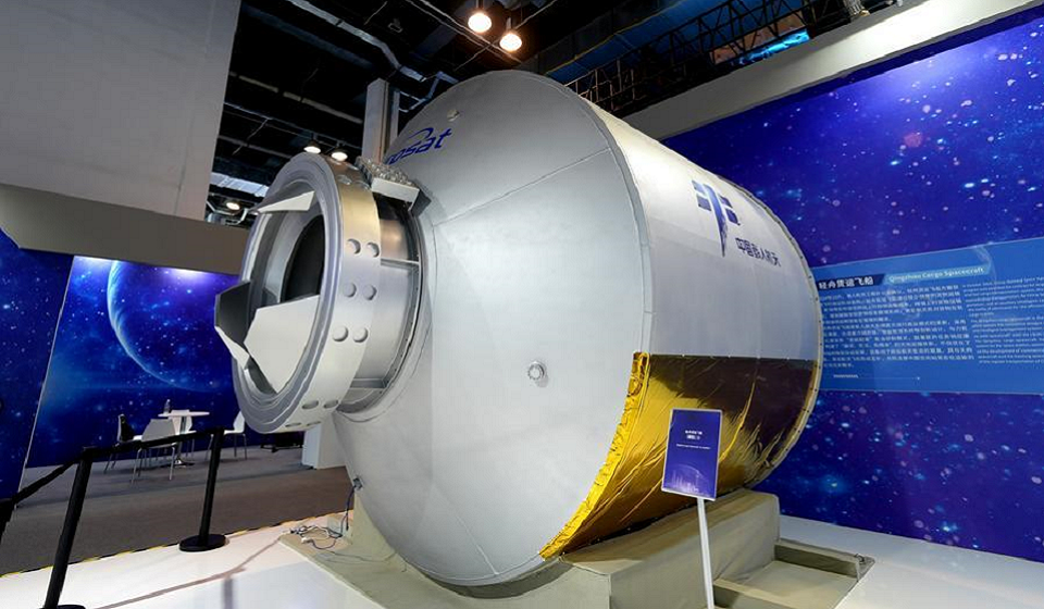 A model of the Qingzhou cargo spacecraft is pictured at the preview of a science exhibition marking the 10th Space Day of China at Shanghai World Expo Exhibition and Convention Center in east China's Shanghai, April 23, 2025. (Xinhua/Zhang Jiansong)