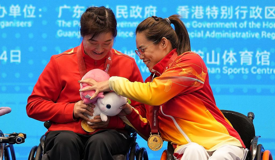 Gold medalists Tan Shumei (L) and Kang Su of Shanghai-Jiangsu United Team celebrate during the awarding ceremony of the women's sabre team of wheelchair fencing at China's 12th National Games for Persons with Disabilities and the 9th National Special Olympic Games in Hong Kong, south China, Dec. 14, 2025. (Xinhua/Hou Zhaokang)