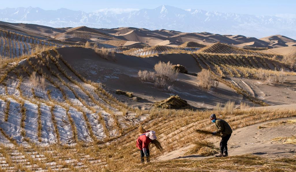 A staff member drives a tractor to transport materials for sand barriers in Kumtag Desert in Kazak Autonomous County of Aksay, northwest China's Gansu Province, Dec. 13, 2025. Covering a total area of 222,000 mu (14,800 hectares), a water conservation, ecological protection and restoration project is underway here, with sub-projects including sand fixation and afforestation. (Photo by Gao Hongshan/Xinhua)