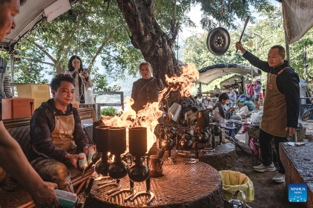 People watch Li Jinhe (R) making coffee at his cafe in Mangkuan Township of Baoshan City, southwest China's Yunnan Province, Nov. 15, 2025.(Xinhua/Gao Yongwei)