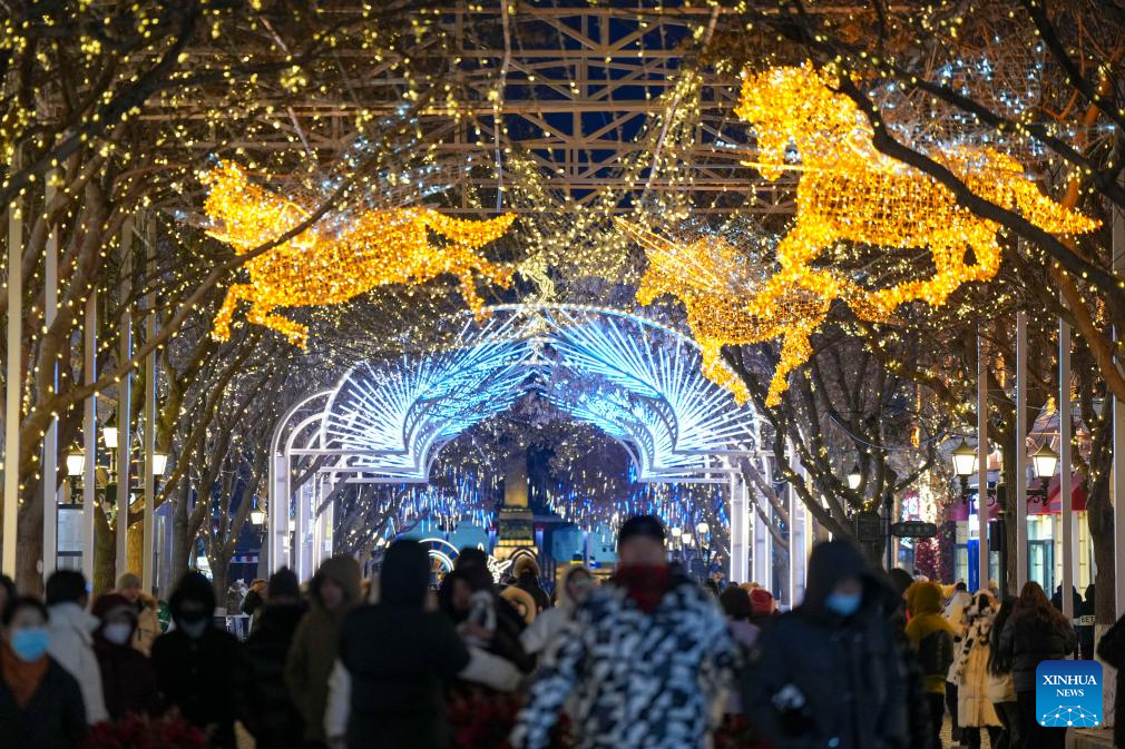 Light decorations are seen on the Central Street in Harbin, capital of northeast China's Heilongjiang Province, Dec. 16, 2025. As one of the most popular attractions in Harbin, the Central Street, which is renowned for its diverse European-style architecture, wows tourists with its ice and snow sculptures and folk shows during the city's tourism boom this winter. (Xinhua/Wang Song)