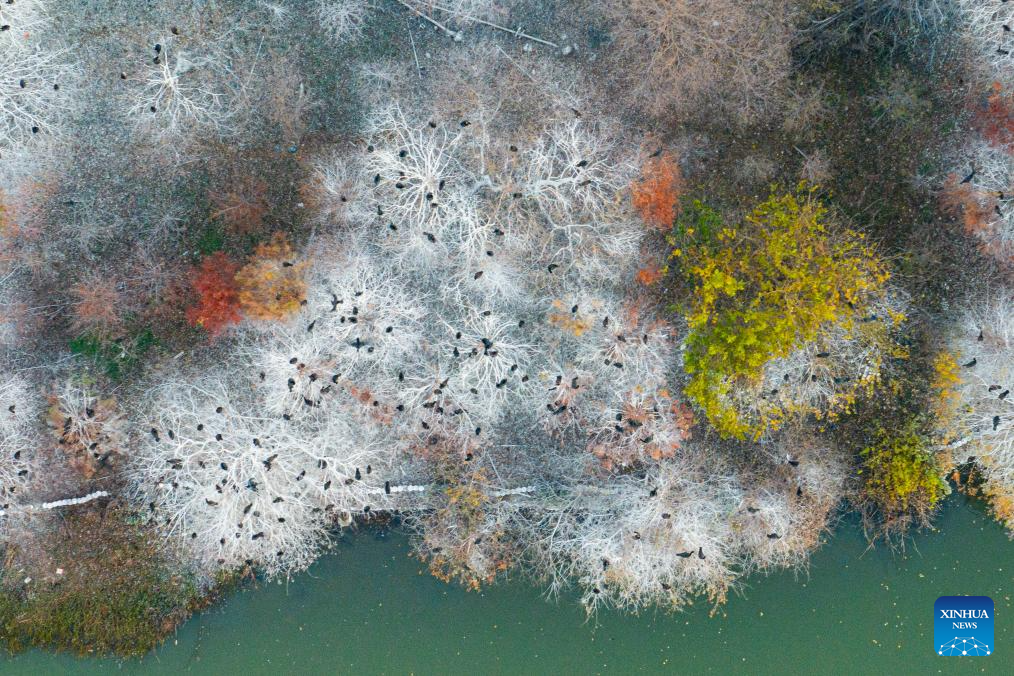 An aerial drone photo taken on Dec. 16, 2025 shows birds resting on trees in the Donghu Lake scenic area in Wuhan, central China's Hubei Province. (Xinhua/Xiao Yijiu)