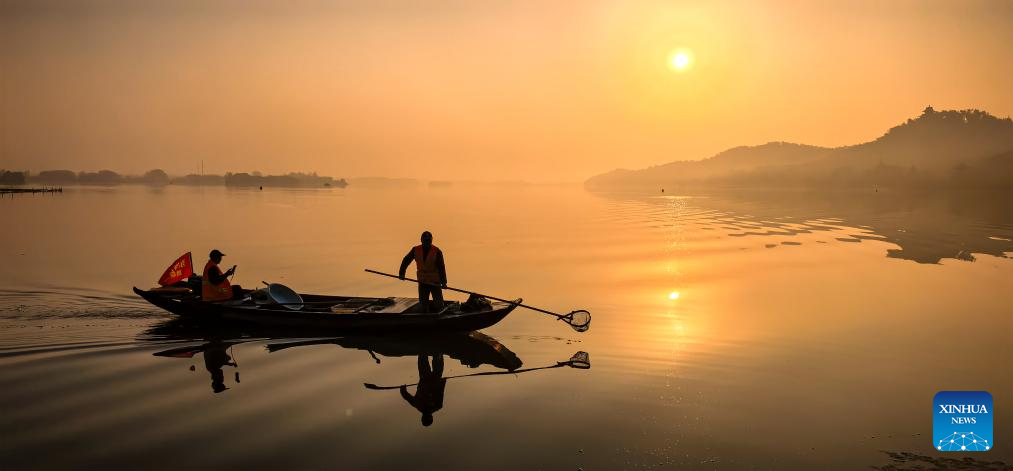 This photo taken on Nov. 16, 2025 shows a staff member cleaning floating objects in the Donghu Lake scenic area in Wuhan, central China's Hubei Province. (Xinhua/Shen Hongbing)