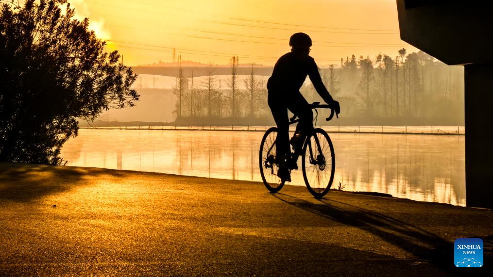 A cyclist rides in the Donghu Lake scenic area in Wuhan, central China's Hubei Province, Dec. 14, 2025. (Xinhua/Xiao Yijiu)