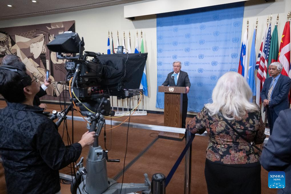 UN Secretary-General Antonio Guterres speaks at a press encounter at the UN headquarters in New York, Dec. 17, 2025. Guterres on Wednesday condemned the continued arbitrary detention of UN personnel by the Houthis in Yemen. (Eskinder Debebe/UN Photo/Handout via Xinhua)