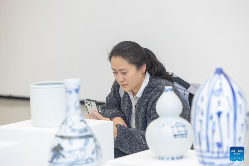 A visitor takes photos of an artwork at an exhibition of children's arts at Sichuan Fine Arts Institute in southwest China's Chongqing, Dec. 18, 2025. This international exhibition of children's arts as part of the 4th China-Europe Humanities and Arts Education Forum opened here on Thursday, featuring 360 artworks by artists aged 3 to 18 from 25 countries. (Xinhua/Huang Wei)