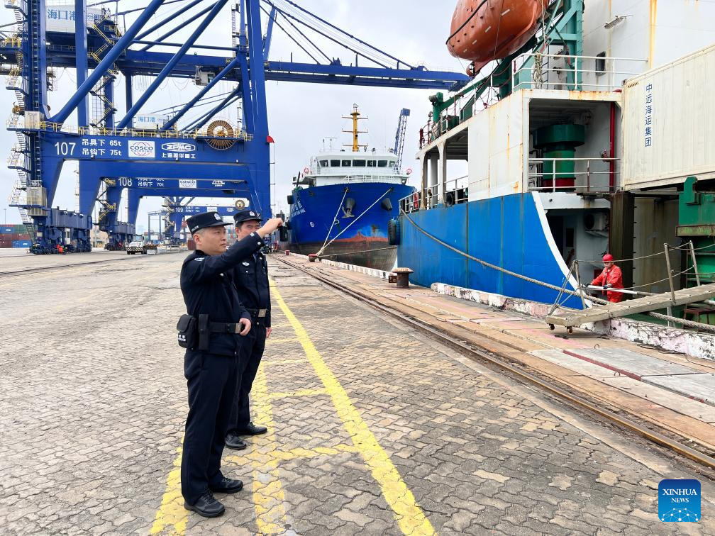 Border inspection officers patrol at a port in Xiuying of Haikou, south China's Hainan Province, Dec. 18, 2025. China on Thursday launched island-wide special customs operations in the Hainan Free Trade Port (FTP). (Photo by Yang Jiyong/Xinhua)