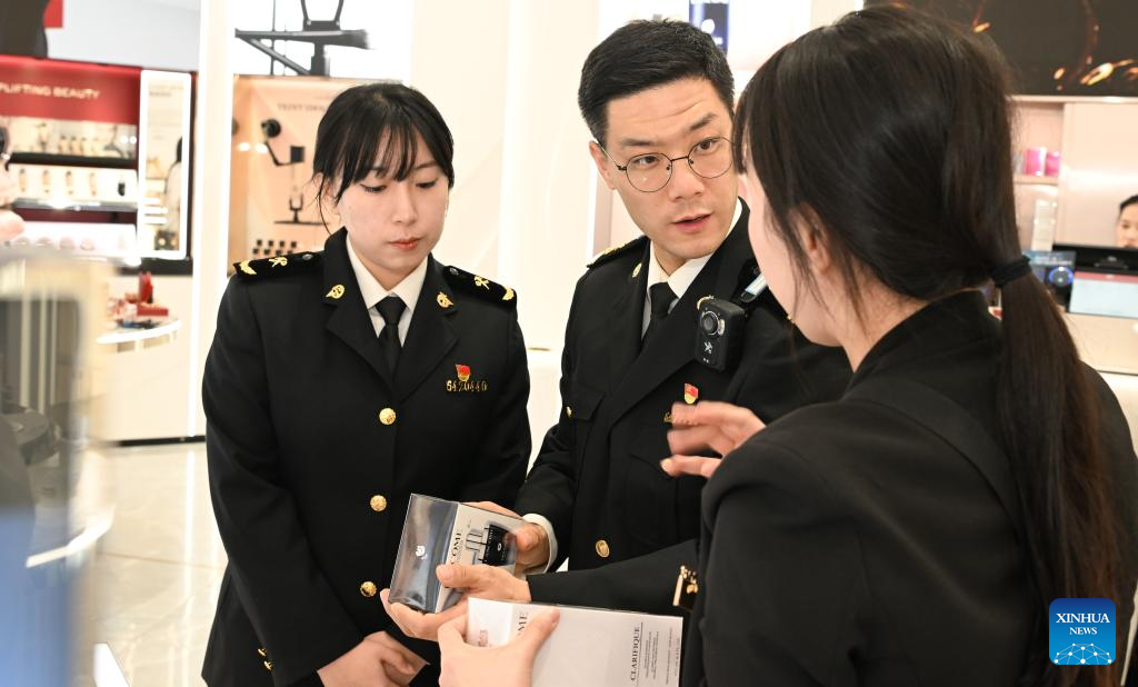 Customs officers perform in-shop checks at Haikou International Duty Free Shopping Complex in Haikou, south China's Hainan Province, Dec. 18, 2025. China on Thursday launched island-wide special customs operations in the Hainan Free Trade Port (FTP). (Xinhua/Yang Guanyu)
