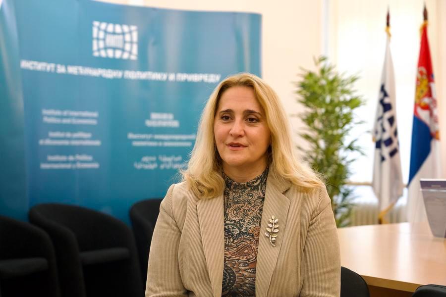Ivona Ladjevac, deputy director of the Institute of International Politics and Economics in Belgrade, speaks during an interview with Xinhua in Belgrade, Serbia, on Dec. 4, 2025. (Photo by Wang Wei/Xinhua)