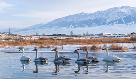 Photo taken on Dec. 17, 2025 shows swans gliding gracefully in the waters of Gaojiahu Wetland Scenic Area in Barkol County, northwest China's Xinjiang Uygur Autonomous Region. The clear water reflects the distant snow-capped mountains, creating a vivid and serene ecological scene. (Zhong Weiliang/Guangming Picture)