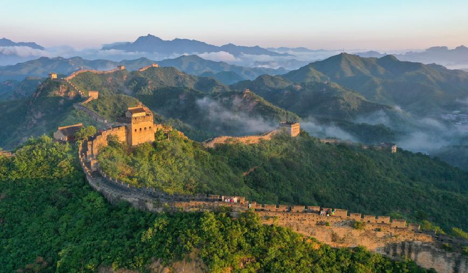 An aerial drone photo taken on Aug. 25, 2025 shows tourists visiting the Jinshanling section of the Great Wall in Luanping County of Chengde, north China's Hebei Province. (Photo by Zhou Wanping/Xinhua)