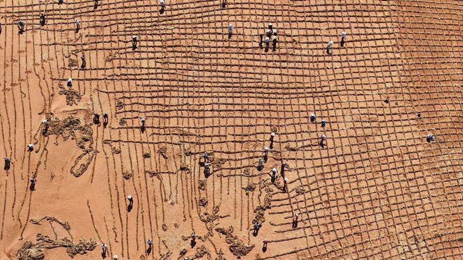 An aerial drone photo taken on June 30, 2025 shows people laying sand barriers at the site of a desertification control project in Zhongewei, northwest China's Ningxia Hui Autonomous Region. (Xinhua/Wang Peng)
