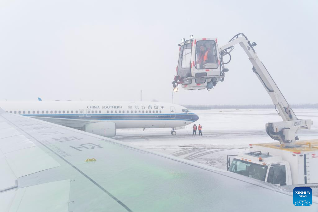 Staff members conduct de-icing and snow removal operations on an aircraft at Harbin Taiping International Airport in Harbin, northeast China's Heilongjiang Province, Dec. 23, 2025. The meteorological observatory of Harbin issued a yellow alert for blizzard on Tuesday. (Xinhua/Xie Jianfei)