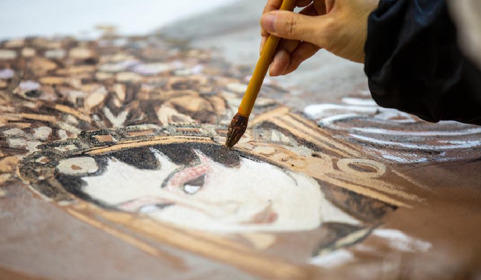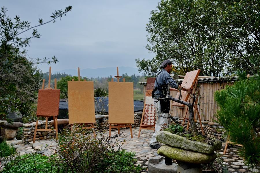 An artist makes boards for rock pigment paintings in Wuyishan City, southeast China's Fujian Province, Dec. 22, 2025. (Photo by Chen Ying/Xinhua)