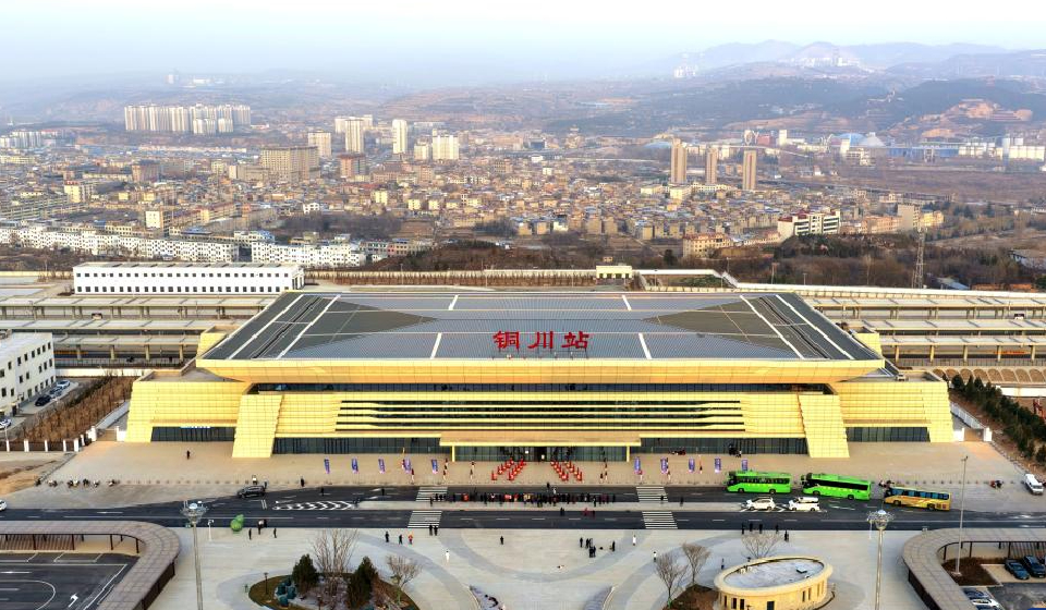An aerial drone photo taken on Dec. 24, 2025 shows Tongchuan Railway Station of a high-speed railway line connecting Xi'an with Yan'an in northwest China's Shaanxi Province. China's Xi'an-Yan'an high-speed railway line in Shaanxi Province will start operation this Friday.
