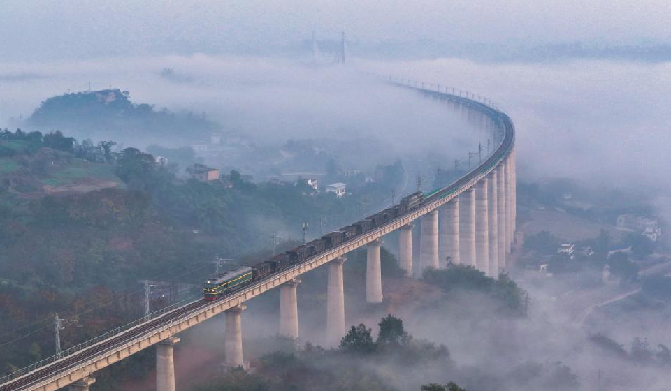 An aerial drone photo taken on Dec. 25, 2025 shows a freight train running on a bridge over the Yangtze River along the Longchang-Luxian-Xuyong railway in Luzhou, southwest China's Sichuan Province. The Longchang-Luxian-Xuyong railway began operation on Thursday as part of China's New International Land-Sea Trade Corridor rail service, which is a crucial logistics link between China's western inland regions and global markets. (Photo by Liao Shengchun/Xinhua)
