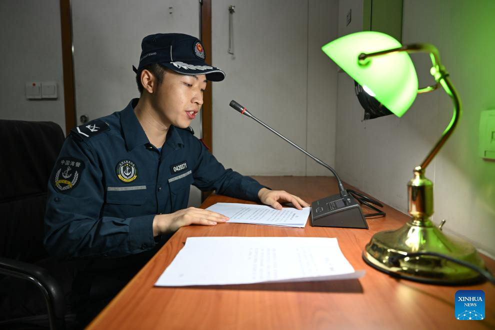 A law enforcer broadcasts before a meal on the China Coast Guard (CCG) vessel Huangyan during a patrol mission in the territorial waters of China's Huangyan Dao, Dec. 5, 2025.
