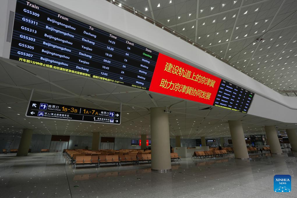 This photo taken on Dec. 25, 2025 shows a waiting hall at the Beijing Tongzhou Railway Station in Beijing, capital of China. The railway station, located in the comprehensive transportation hub of Beijing's sub-center Tongzhou District, will be officially put into operation on Dec. 30. (Xinhua/Ju Huanzong)