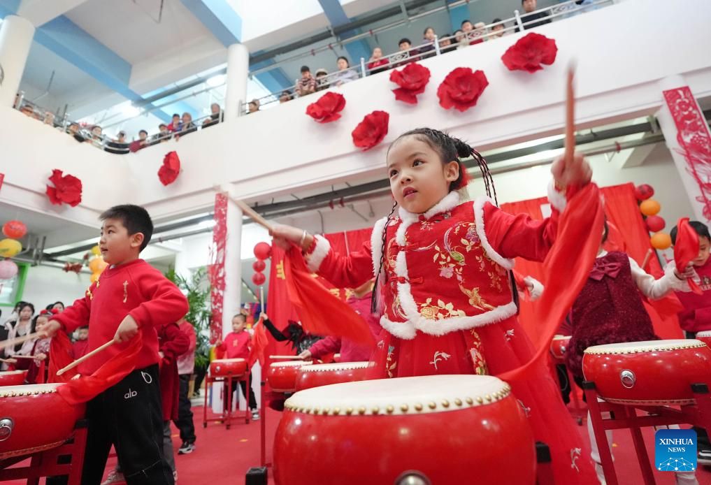 Children perform a drum dance at a kindergarten in Yinchuan, northwest China's Ningxia Hui Autonomous Region, Dec. 27, 2025. As the New Year approaches, a kindergarten in Yinchuan City held an activity and invited inheritors of intangible cultural heritage to promote lion dance, paper-cutting making and sugar painting. (Xinhua/Wang Peng)