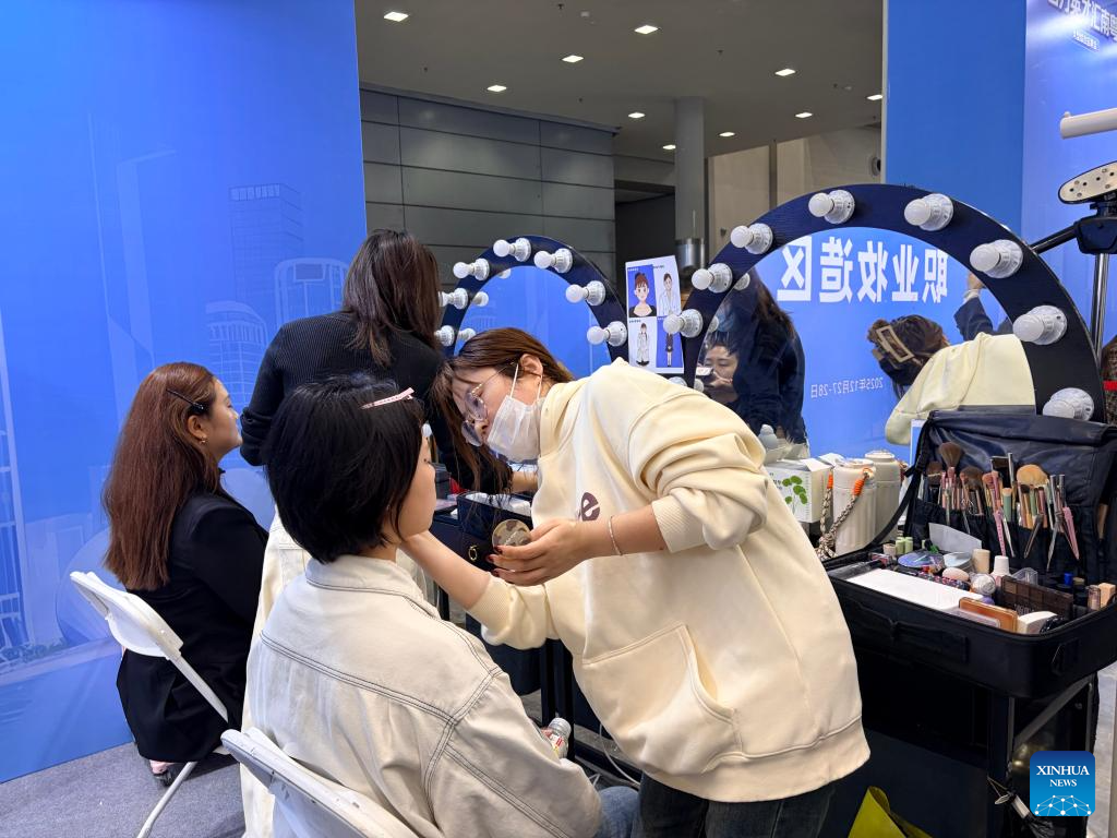 Job seekers receive free makeup services at a job fair in Shenzhen, south China's Guangdong Province, Dec. 27, 2025. The job fair at the Shenzhen Convention and Exhibition Center (Futian) on Saturday brought together 1,825 employers, providing more than 65,000 job positions for job seekers. (Xinhua/Zhao Ruixi)