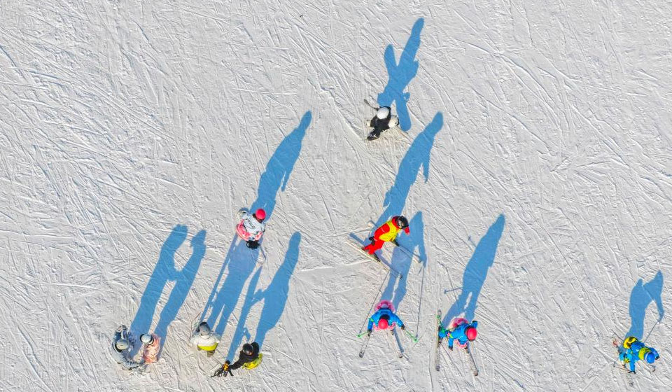 This aerial drone photo taken on Dec. 28, 2025 shows people skiing at a ski resort in Yutian County of north China's Hebei Province. (Photo by Liu Mancang/Xinhua)