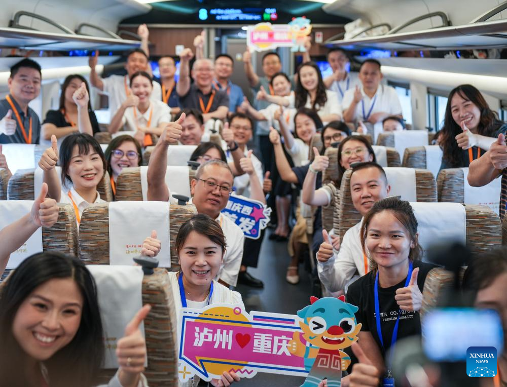 Passengers pose for a group photo inside a carriage of the G5766 bullet train running on the Chongqing West to Yibin East section of Chongqing-Kunming high-speed railway in southwest China, Sept. 29, 2024. The section connecting southwest China's Chongqing municipality and Sichuan's Yibin City began operation on the same day, with the fastest travel time between the two places being 48 minutes. China, home to the world's largest high-speed rail network, has expanded its total operational mileage beyond 50,000 kilometers with the launch of a new high-speed line.
