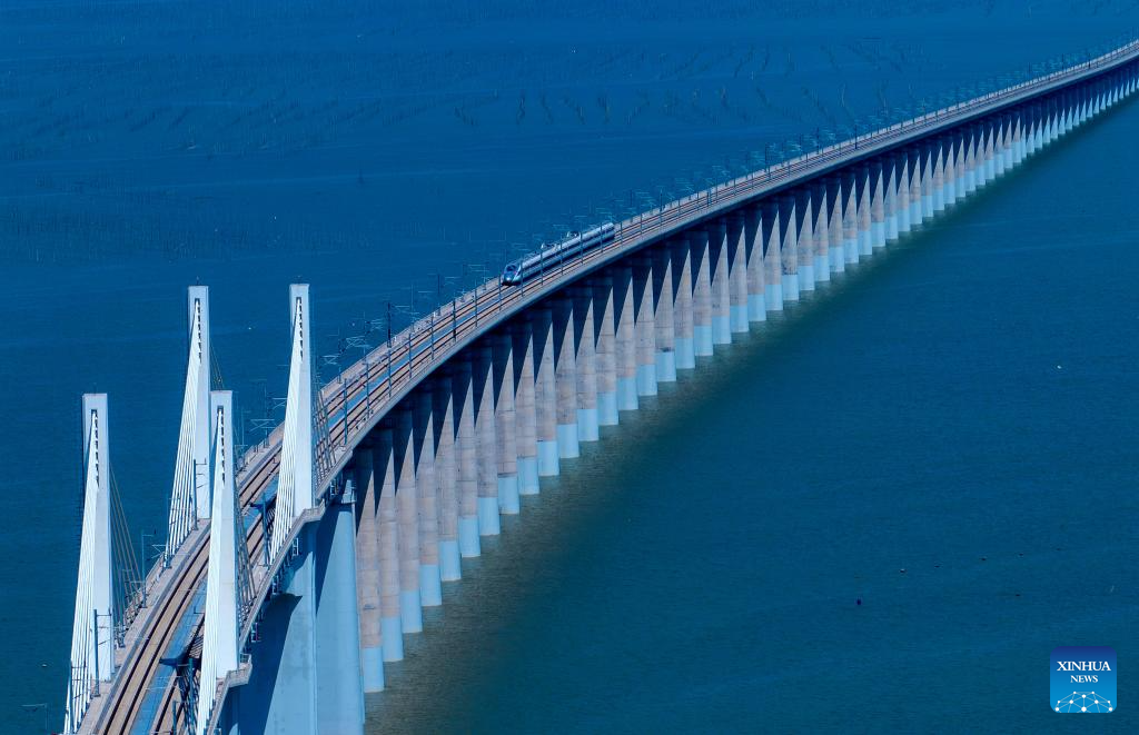 An aerial drone photo taken on Sept. 19, 2023 shows a test train running on the Meizhou Bay cross-sea bridge along the Fuzhou-Xiamen-Zhangzhou high-speed railway in southeast China's Fujian Province. China, home to the world's largest high-speed rail network, has expanded its total operational mileage beyond 50,000 kilometers with the launch of a new high-speed line.
