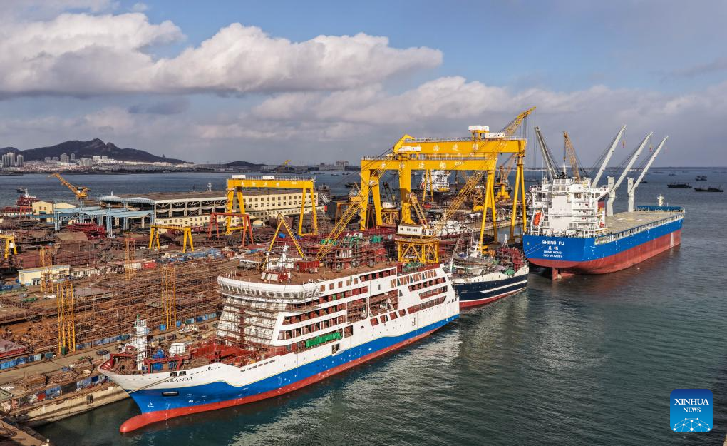 An aerial drone photo taken on Dec. 25, 2025 shows a shipbuilding enterprise conducting shipbuilding and maintenance work in Rongcheng, east China's Shandong Province. In recent years, Shandong has been committed to building a high-end industrial cluster integrating shipbuilding and marine engineering equipment in Shandong Peninsula, embarking on a high-quality development path driven by the marine economy. (Photo by Li Xinjun/Xinhua)