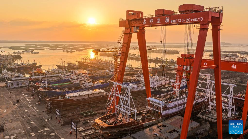 An aerial drone photo taken on Dec. 24, 2025 shows a shipbuilding enterprise conducting shipbuilding work in Rongcheng, east China's Shandong Province. In recent years, Shandong has been committed to building a high-end industrial cluster integrating shipbuilding and marine engineering equipment in Shandong Peninsula, embarking on a high-quality development path driven by the marine economy. (Photo by Li Xinjun/Xinhua)