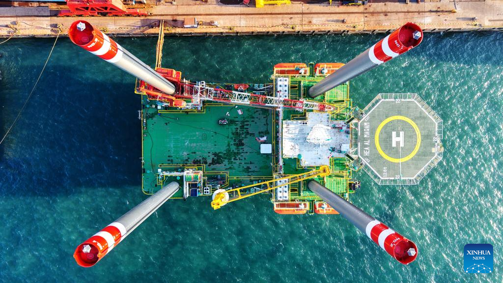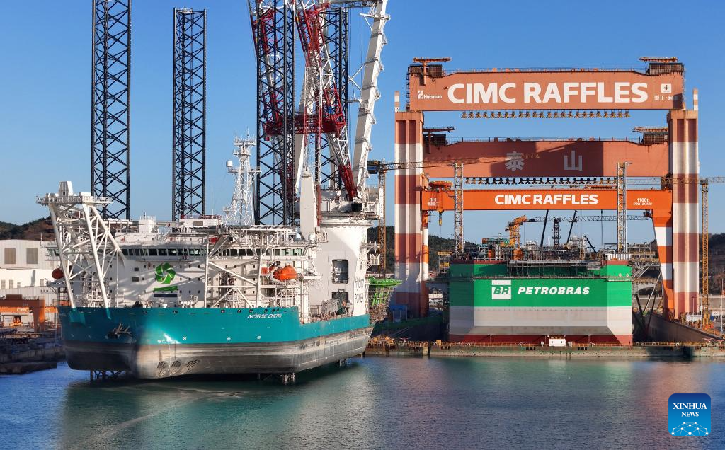 An aerial drone photo taken on Dec. 24, 2025 shows the marine engineering equipment conducting building work at the construction base of CIMC Raffles in Yantai, east China's Shandong Province. In recent years, Shandong has been committed to building a high-end industrial cluster integrating shipbuilding and marine engineering equipment in Shandong Peninsula, embarking on a high-quality development path driven by the marine economy. (Photo by Tang Ke/Xinhua)